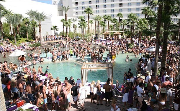 Rehab is located inside the Hard Rock Hotel. The original pool party that started it all has not skipped a beat and continues to earn its reputation as the wildest and craziest by far. Numerous cabanas, daybeds, and chaise lounge chairs surround the main pool where all the action goes down. There are additional cabanas on an upper level which overlook the entire main pool so you won't miss a thing.