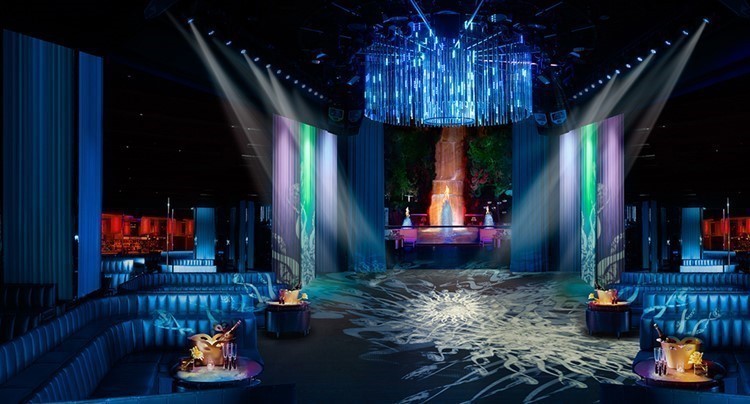 Intrigue Nightclub features a main room with VIP booths surrounding the dance floor. Additional booths are lined against the back wall facing the DJ booth up front. The outside patio area features views of the 90+ foot waterfall that splashes down into the lagoon.